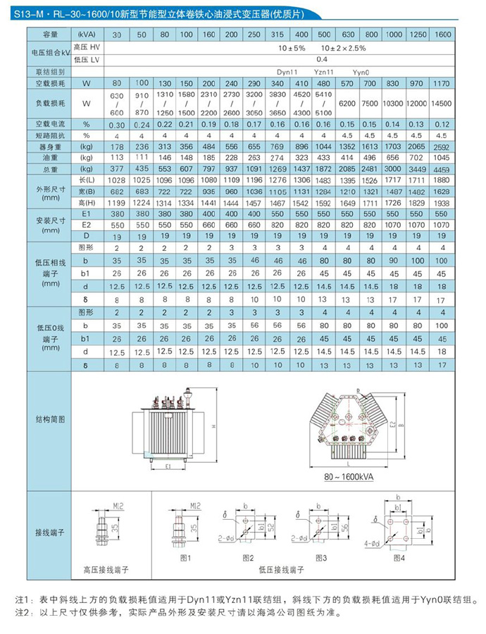 華盈S13-M.RL系列10kV     三相油浸式卷鐵芯雙繞組無勵磁調壓配電變壓器技術參數: